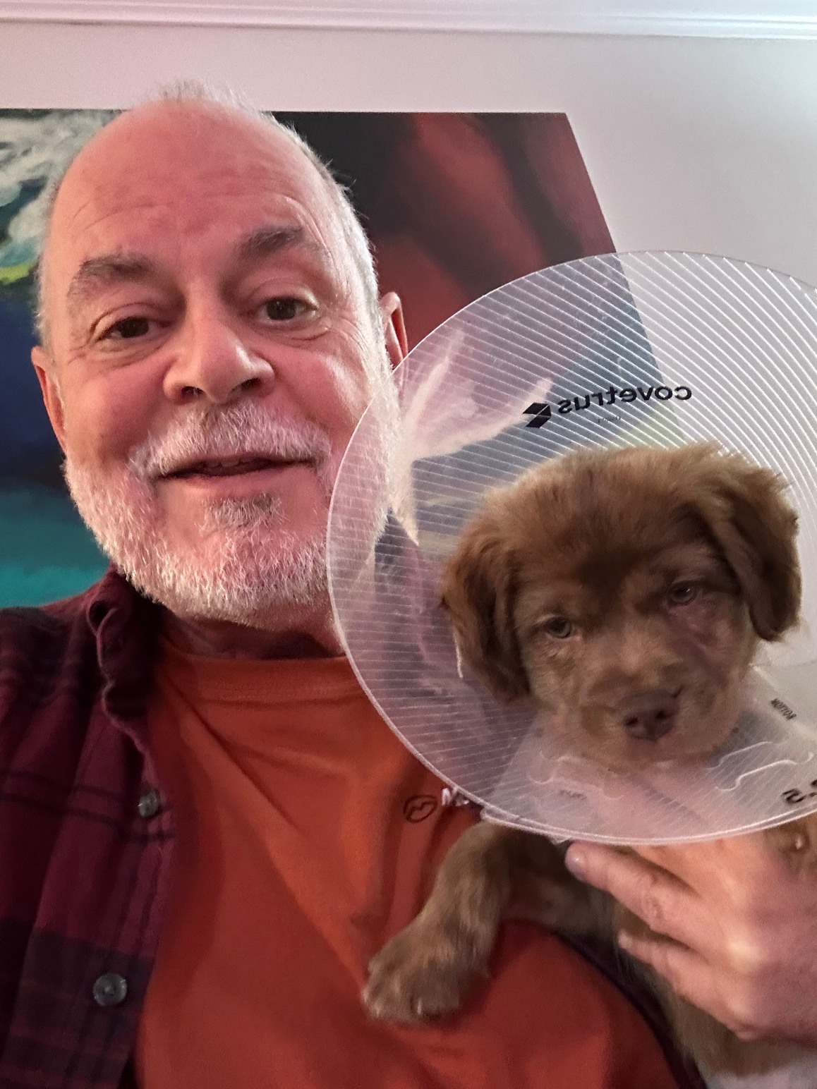 Mavis was the last pup they brought out. Like her sisters, she was in a cone. I’m glad. Without it, she’d definitely be messing with her incision. Recent experience with Tootsie in a cone helped. We’ll see about taking it off when she sees our vet on the 30th.